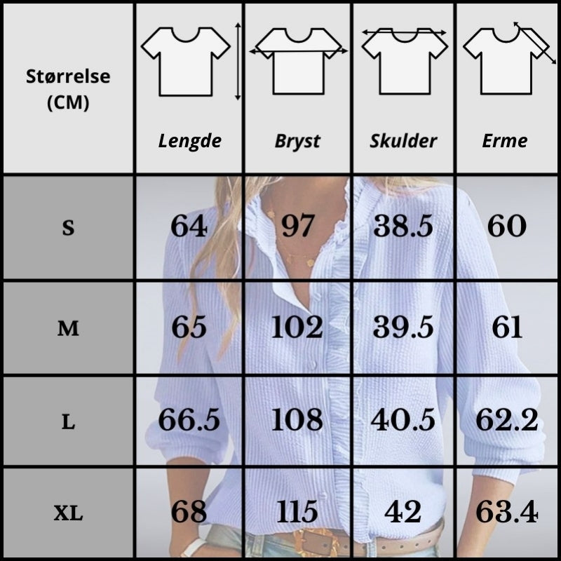 Se for deg dette: morgensol gjennom vinduet, en kopp te i hånden, og Augusta™ faller mykt over skuldrene dine – luftig, feminin og selvsikker. Denne skjorten gir deg umiddelbar eleganse, enten dagen din byr på møter eller middag med venner.