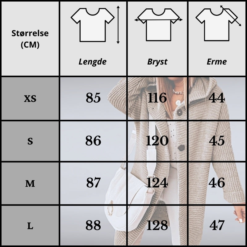 Tenk deg dette: en frisk morgentur, en lett bris i håret, mens du holder deg varm og stilfull med Elise™. Denne allsidige strikkede kåpen med hette kombinerer komfort og klasse. Perfekt for sesongene hvor du ønsker både stil og varme, uten å gå på kompromiss med komfort.