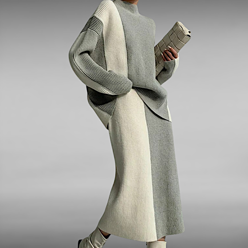 Med Solveig™ får du en raffinert stil med dette to-delte settet, bestående av en oversized genser og et elegant skjørt. Det kontrasterende svart-hvitt designet gir et tidløst, minimalistisk utseende som passer til enhver anledning. Det høykvalitets, myke materialet gir maksimal komfort og holder deg varm på kaldere dager. Kombiner Solveig™-settet enkelt med dine favorittilbehør!
